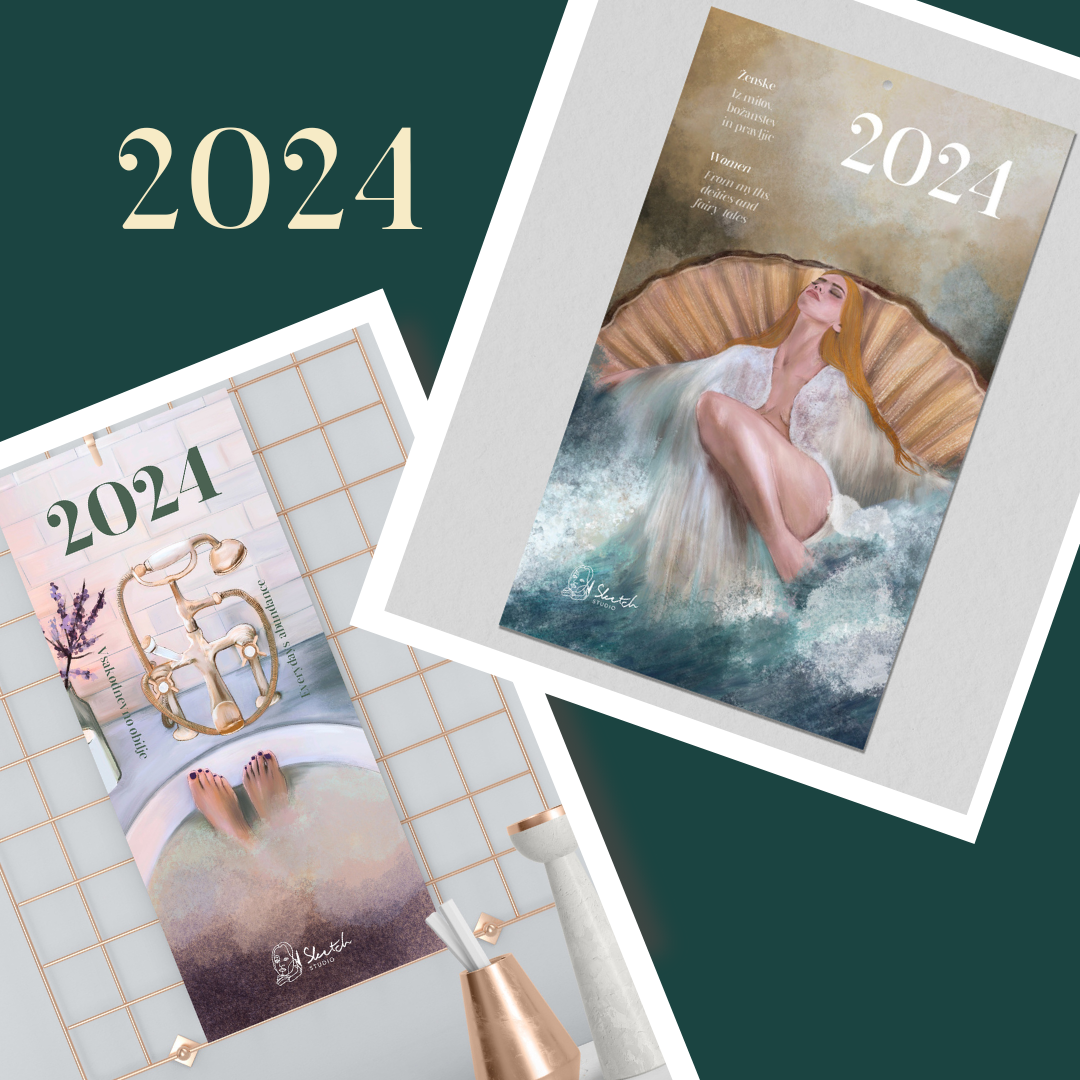 Komplet manjšega koledarja (z ilustracijami 13x18 cm) in velikega koledarja ( z ilustracijami 21x30 cm) za leto 2024. Manjši je inspiracijo našel v trenutkih iz vsakodnevnega življenja, ki simbolizirajo pravo obilje, večji pa iz ženskih likov iz zgodovine, pravljic in božanstev.