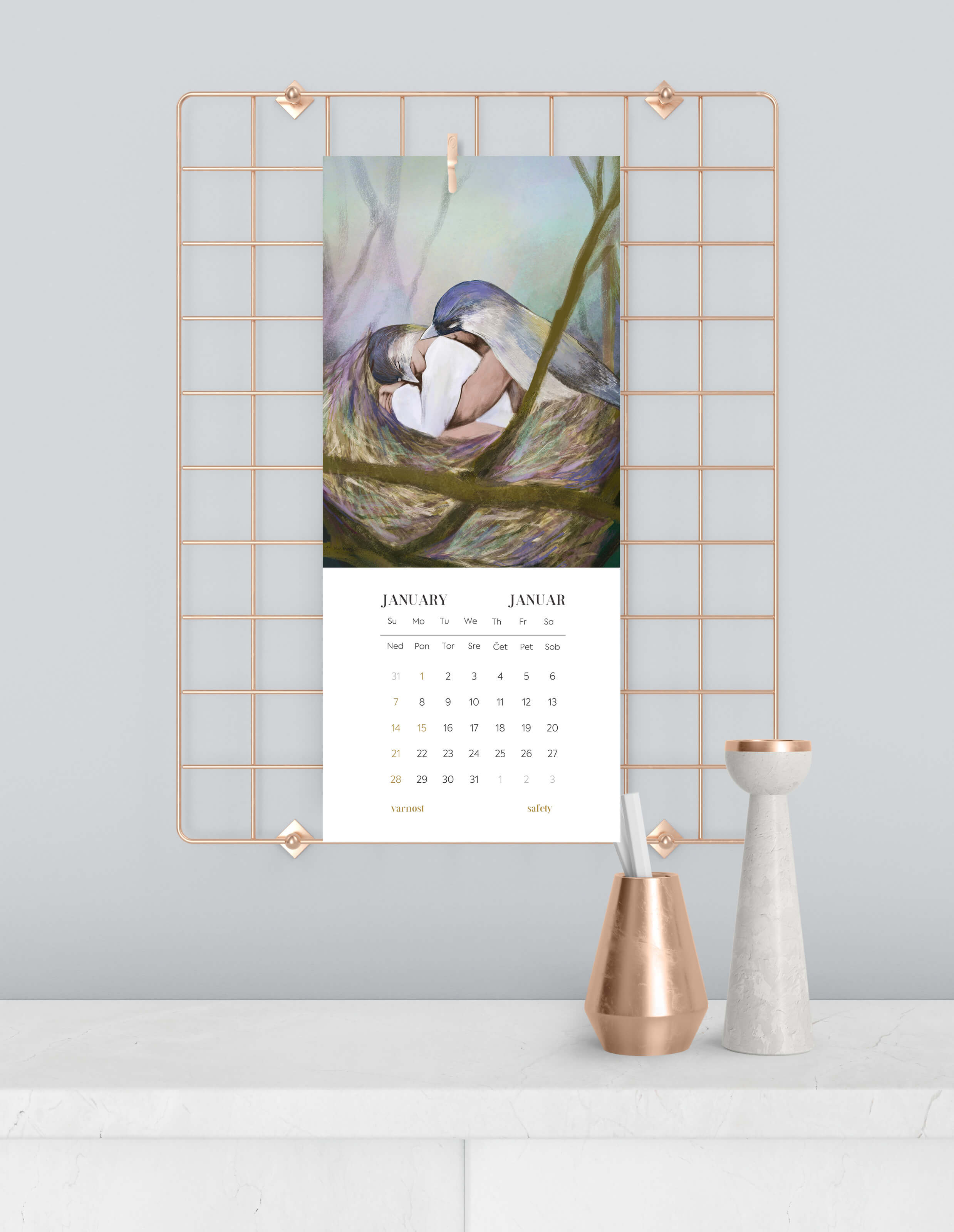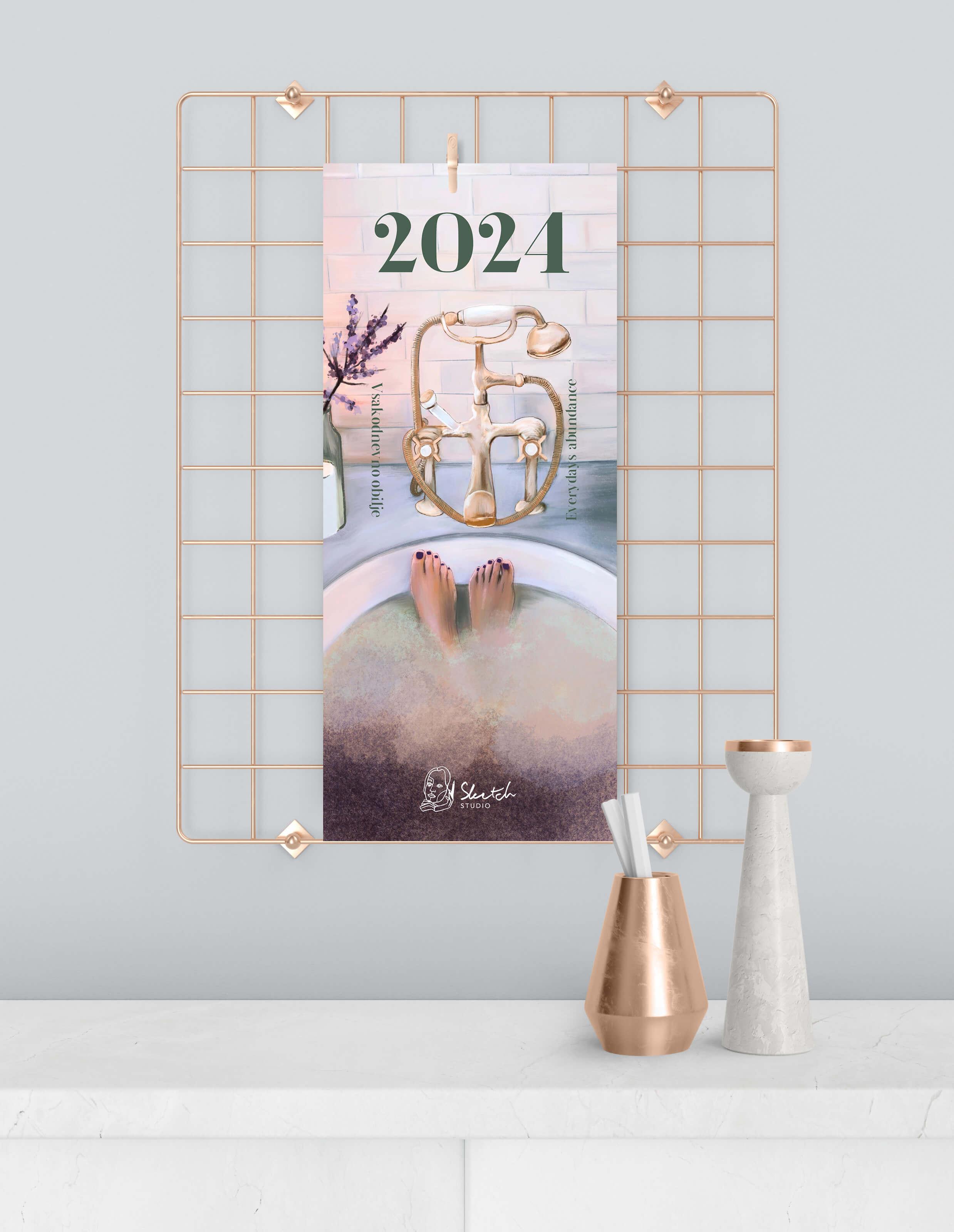 I found inspiration in the everyday moments of selfcare, for loved ones, the simplest moments in which I find abundance. The illustrations were created in my usual, combined technique - a combination of hand and digital drawing. The format of the calendar is 13.5 x 30 cm, 13 sheets connected with a hole on which you hang it. It contains 12 illustrations measuring 13x18 cm, which you can frame after the end of the month/year. The calendar is printed on 300g paper and this year's edition does not have motivational thoughts, but rather a couple of concepts that, in my opinion, describe everyday abundance and are everyone's everyday wishes. Each calendar also comes with a greeting card. Pre-orders are available until 10.11, the discount also applies to larger quantities and when ordering business gifts.
