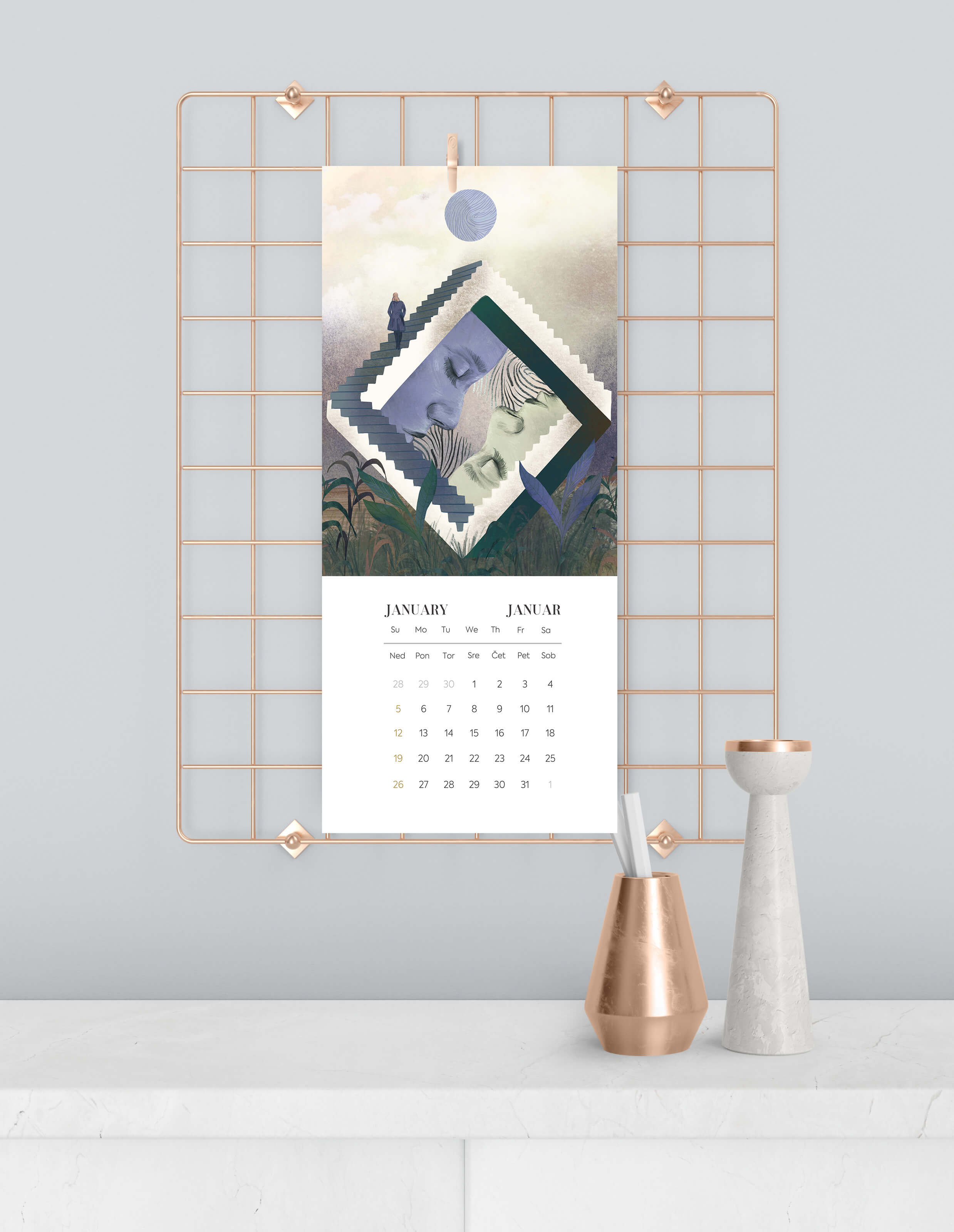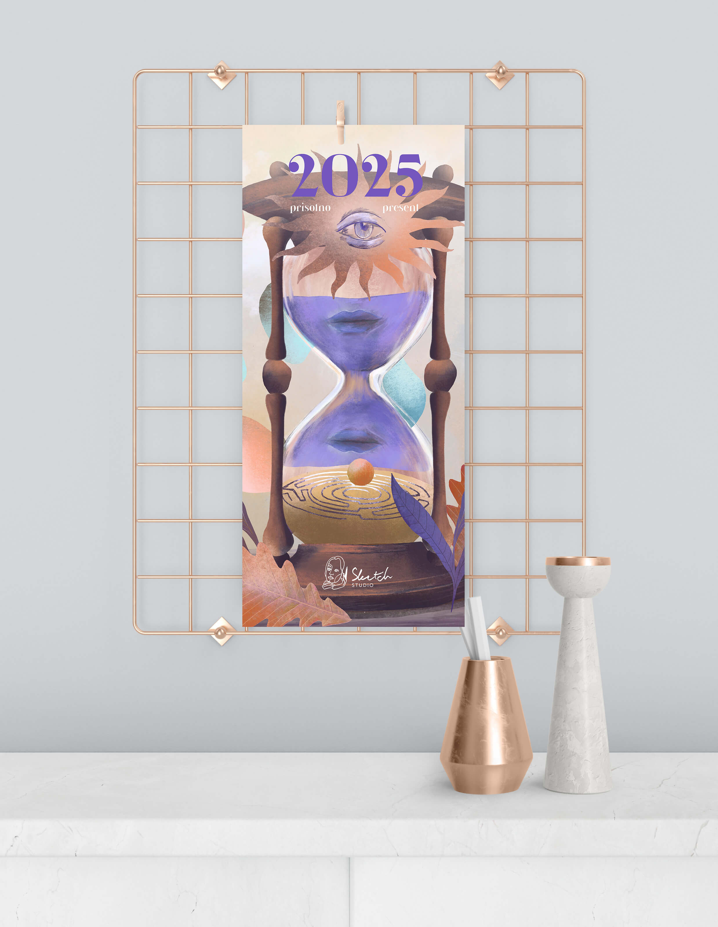 Je našel inspiracijo v občutku prisotnosti, ki je tudi največja želja zame in za vas v prihodnjem letu. Naj bo to prisotnost v trenutku, odnosu, skrbi zase, prisotnost pri osebnem napredku, projektu… tukaj in zdaj. Ilustracije so nastale v moji običajni, kombinirani tehniki - kombinaciji ročne in digitalne risbe. Format koledarja je 13,5 x 30 cm 13 listov povezanih z luknjico, na katero ga obesiš. Zajema 12 ilustracij v dimenziji 13x 18 cm , ki jih po koncu meseca/ leta lahko ookviriš. Koledar je tiskan na 300g papir. Vsak koledar prejme tudi voščilnico. Prednaročila potekajo do 4.11, prav tako popust velja za večje količine in ob naročilu poslovnih daril.