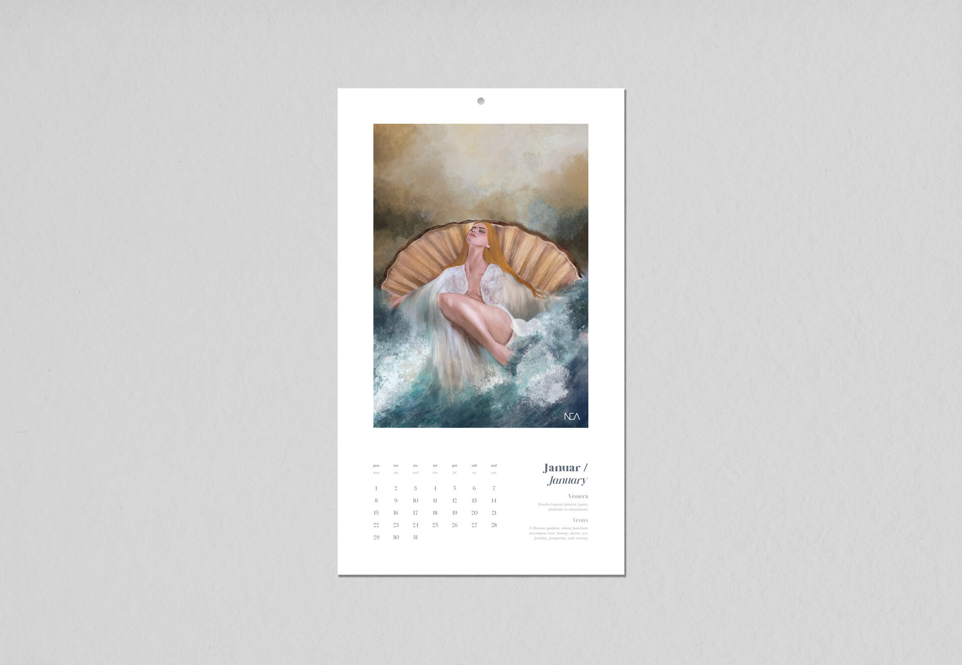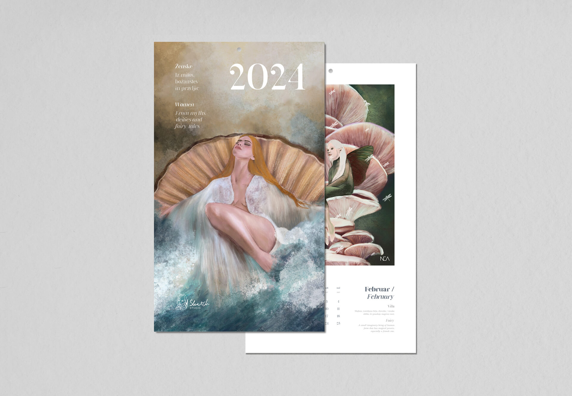 Velik koledar za leto 2024 vsebuje 12 ilustracij v velikosti 21x30 cm, inspiriranih iz ženskih likov iz mitologije, zgodovine, pravljic in božanstev.